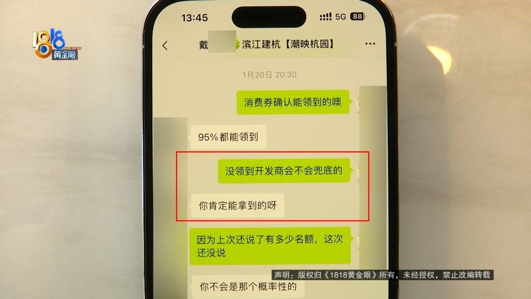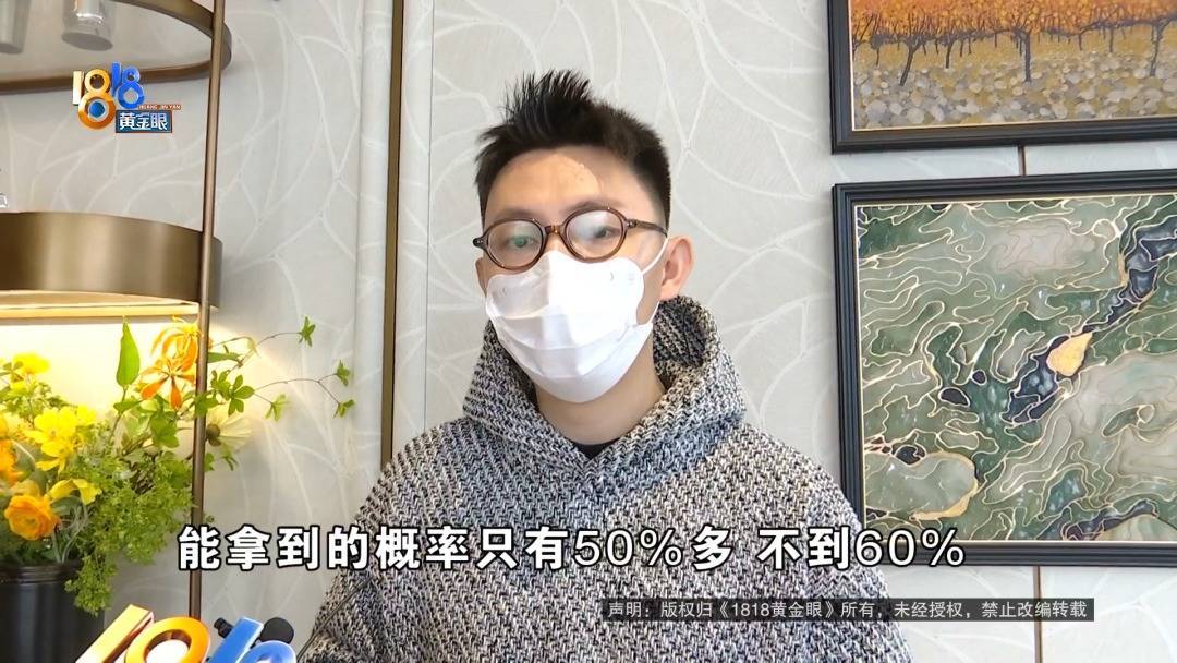 陈先生:是3月31号之前首付交掉,网签成功你才有资格去参与,所以很多人赶在了这个旺季3月份,为了参加这个活动,然后就把这个钱交掉了。但是后来等到这个钱交掉以后,3月31号截止之后,然后又跟我们说,情况不是这样的,能拿到的概率只有50%多,不到60%。